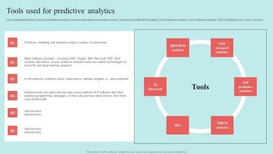 This slide depicts the tools used for predictive analytics to perform operations in predictive models. These tools include SPSS statistics, SAS advanced analytics, SAP predictive analytics, TIBCO Statistica, H2O, and Q research. Whether you have daily or monthly meetings, a brilliant presentation is necessary. Predictive Data Model Tools Used For Predictive Analytics Download PDF can be your best option for delivering a presentation. Represent everything in detail using Predictive Data Model Tools Used For Predictive Analytics Download PDF and make yourself stand out in meetings. The template is versatile and follows a structure that will cater to your requirements. All the templates prepared by Slidegeeks are easy to download and edit. Our research experts have taken care of the corporate themes as well. So, give it a try and see the results.