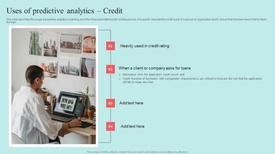 This slide describes the usage of predictive analytics in banking and other financial institutions for credit purposes. It is used to calculate the credit score of a person or organization and to ensure that borrower doesnot fail to return the loan. If you are looking for a format to display your unique thoughts, then the professionally designed Predictive Data Model Uses Of Predictive Analytics Credit Information PDF is the one for you. You can use it as a Google Slides template or a PowerPoint template. Incorporate impressive visuals, symbols, images, and other charts. Modify or reorganize the text boxes as you desire. Experiment with shade schemes and font pairings. Alter, share or cooperate with other people on your work. Download Predictive Data Model Uses Of Predictive Analytics Credit Information PDF and find out how to give a successful presentation. Present a perfect display to your team and make your presentation unforgettable.