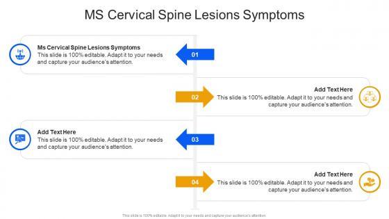 Introducing our well designed Ms Cervical Spine Lesions Symptoms In Powerpoint And Google Slides Cpb. This PowerPoint design presents information on topics like Ms Cervical Spine Lesions Symptoms. As it is predesigned it helps boost your confidence level. It also makes you a better presenter because of its high quality content and graphics. This PPT layout can be downloaded and used in different formats like PDF, PNG, and JPG. Not only this, it is available in both Standard Screen and Widescreen aspect ratios for your convenience. Therefore, click on the download button now to persuade and impress your audience. Our Ms Cervical Spine Lesions Symptoms In Powerpoint And Google Slides Cpb are topically designed to provide an attractive backdrop to any subject. Use them to look like a presentation pro.