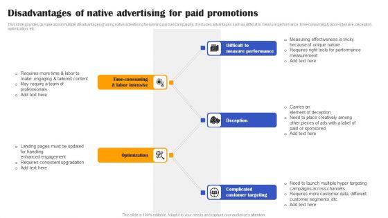 This slide provides glimpse about multiple disadvantages of using native advertising for running paid ad campaigns. It includes advantages such as difficult to measure performance, time consuming and labor intensive, deception, optimization, etc. Find highly impressive Disadvantages Native Advertising Comprehensive Guide For Paid Media Marketing Strategies Rules Pdf on Slidegeeks to deliver a meaningful presentation. You can save an ample amount of time using these presentation templates. No need to worry to prepare everything from scratch because Slidegeeks experts have already done a huge research and work for you. You need to download Disadvantages Native Advertising Comprehensive Guide For Paid Media Marketing Strategies Rules Pdf for your upcoming presentation. All the presentation templates are 100 percent editable and you can change the color and personalize the content accordingly. Download now This slide provides glimpse about multiple disadvantages of using native advertising for running paid ad campaigns. It includes advantages such as difficult to measure performance, time consuming and labor intensive, deception, optimization, etc.