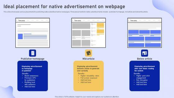 This slide showcases various placements for publishing native advertisement on webpages. Three placements for native advertisements include publisher homepage, mid article and below the article Retrieve professionally designed Ideal Placement For Native Advertisement On Webpage Ppt PowerPoint Presentation Diagram Lists PDF to effectively convey your message and captivate your listeners. Save time by selecting pre made slideshows that are appropriate for various topics, from business to educational purposes. These themes come in many different styles, from creative to corporate, and all of them are easily adjustable and can be edited quickly. Access them as PowerPoint templates or as Google Slides themes. You do not have to go on a hunt for the perfect presentation because Slidegeeks got you covered from everywhere.