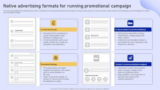 This showcases different formats that can be used by marketers for running native advertisement campaign. Formats for native ads are in feed social ads, in feed content recommendations, promoted listings and content recommendation widgets. Presenting this PowerPoint presentation, titled Strategic Performance Marketing Campaign Native Advertising Formats For Running Professional Pdf, with topics curated by our researchers after extensive research. This editable presentation is available for immediate download and provides attractive features when used. Download now and captivate your audience. Presenting this Strategic Performance Marketing Campaign Native Advertising Formats For Running Professional Pdf. Our researchers have carefully researched and created these slides with all aspects taken into consideration. This is a completely customizable Strategic Performance Marketing Campaign Native Advertising Formats For Running Professional Pdf that is available for immediate downloading. Download now and make an impact on your audience. Highlight the attractive features available with our PPTs. This showcases different formats that can be used by marketers for running native advertisement campaign. Formats for native ads are in feed social ads, in feed content recommendations, promoted listings and content recommendation widgets.