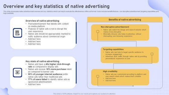 This slide showcases native advertisement overview and key statistics which can help to evaluate the effectiveness of this ad format. It also include benefits that are non disruptive advertisement, targeting capabilities and high credibility Create an editable Overview And Key Statistics Of Native Advertising Ppt PowerPoint Presentation Diagram Lists PDF that communicates your idea and engages your audience. Whether youre presenting a business or an educational presentation, pre designed presentation templates help save time. Overview And Key Statistics Of Native Advertising Ppt PowerPoint Presentation Diagram Lists PDF is highly customizable and very easy to edit, covering many different styles from creative to business presentations. Slidegeeks has creative team members who have crafted amazing templates. So, go and get them without any delay.
