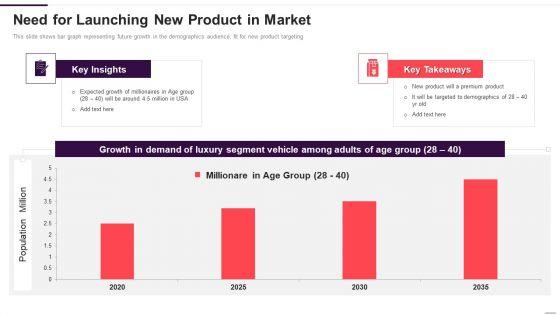 This slide shows bar graph representing future growth in the demographics audience, fit for new product targeting. Deliver and pitch your topic in the best possible manner with this go to market strategy for new product need for launching new product demonstration pdf. Use them to share invaluable insights on need for launching new product and impress your audience. This template can be altered and modified as per your expectations. So, grab it now.