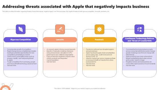 This slide provides information regarding threats of brand that impose negative impact over firms success. Key Apples threats include rigorous competition, lawsuits, pandemic, etc. Find a pre designed and impeccable Addressing Threats Associated With Apple That Negatively Impacts Business Ideas PDF. The templates can ace your presentation without additional effort. You can download these easy to edit presentation templates to make your presentation stand out from others. So, what are you waiting for Download the template from Slidegeeks today and give a unique touch to your presentation.
