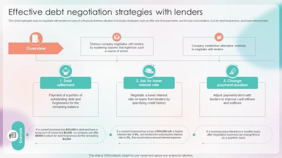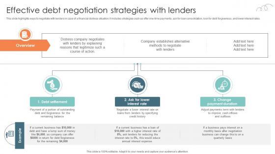 This slide highlights ways to negotiate with lenders in case of a financial distress situation. It includes strategies such as offer one-time payments, ask for loan consolidation, look for debt forgiveness, and lower interest rates. From laying roadmaps to briefing everything in detail, our templates are perfect for you. You can set the stage with your presentation slides. All you have to do is download these easy-to-edit and customizable templates. Strategies For Stabilizing Corporate Effective Debt Negotiation Strategies With Lenders will help you deliver an outstanding performance that everyone would remember and praise you for. Do download this presentation today. This slide highlights ways to negotiate with lenders in case of a financial distress situation. It includes strategies such as offer one-time payments, ask for loan consolidation, look for debt forgiveness, and lower interest rates.