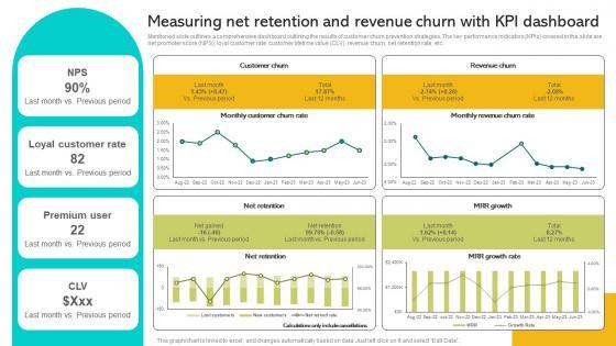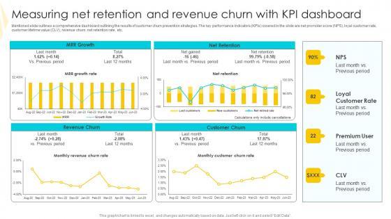 Mentioned slide outlines a comprehensive dashboard outlining the results of customer churn prevention strategies. The key performance indicators KPIs covered in the slide are net promoter score NPS, loyal customer rate, customer lifetime value CLV, revenue churn, net retention rate, etc. Do you have to make sure that everyone on your team knows about any specific topic I yes, then you should give Measuring Net Retention And Revenue Churn With KPI Dashboard Introduction PDF a try. Our experts have put a lot of knowledge and effort into creating this impeccable Measuring Net Retention And Revenue Churn With KPI Dashboard Introduction PDF. You can use this template for your upcoming presentations, as the slides are perfect to represent even the tiniest detail. You can download these templates from the Slidegeeks website and these are easy to edit. So grab these today.
