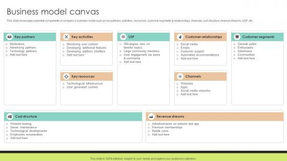 This slide showcases essential components of companys business model such as key partners, activities, resources, customer segments and relationships, channels, cost structure, revenue streams, USP, etc. Find a pre-designed and impeccable Business Model Canvas Community Networking Platform Business Model. The templates can ace your presentation without additional effort. You can download these easy-to-edit presentation templates to make your presentation stand out from others. So, what are you waiting for Download the template from Slidegeeks today and give a unique touch to your presentation. This slide showcases essential components of companys business model such as key partners, activities, resources, customer segments and relationships, channels, cost structure, revenue streams, USP, etc.
