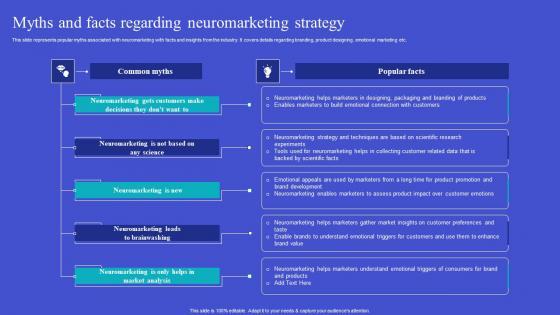 This slide represents popular myths associated with neuromarketing with facts and insights from the industry. It covers details regarding branding, product designing, emotional marketing etc. Are you searching for a Myths And Facts Regarding Neuromarketing Strategy Driven Digital Marketing Microsoft Pdf that is uncluttered, straightforward, and original Its easy to edit, and you can change the colors to suit your personal or business branding. For a presentation that expresses how much effort you have put in, this template is ideal With all of its features, including tables, diagrams, statistics, and lists, its perfect for a business plan presentation. Make your ideas more appealing with these professional slides. Download Myths And Facts Regarding Neuromarketing Strategy Driven Digital Marketing Microsoft Pdf from Slidegeeks today. This slide represents popular myths associated with neuromarketing with facts and insights from the industry. It covers details regarding branding, product designing, emotional marketing etc.