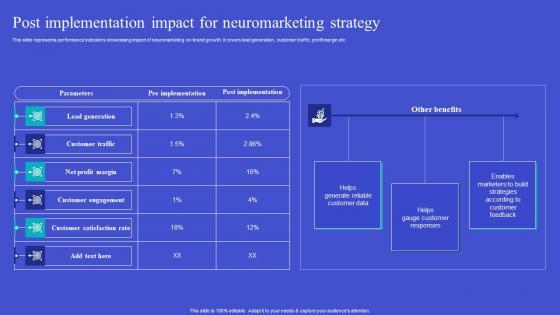 This slide represents performance indicators showcasing impact of neuromarketing on brand growth. It covers lead generation, customer traffic, profit margin etc. Find a pre-designed and impeccable Post Implementation Impact For Neuromarketing Strategy Driven Digital Marketing Template Pdf. The templates can ace your presentation without additional effort. You can download these easy-to-edit presentation templates to make your presentation stand out from others. So, what are you waiting for Download the template from Slidegeeks today and give a unique touch to your presentation. This slide represents performance indicators showcasing impact of neuromarketing on brand growth. It covers lead generation, customer traffic, profit margin etc.