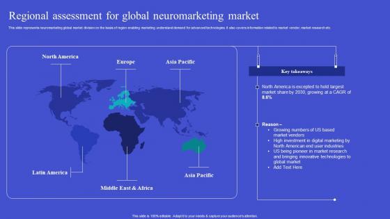 This slide represents neuromarketing global market division on the basis of region enabling marketing understand demand for advanced technologies. It also covers information related to market vendor, market research etc. The Exploring Neuromarketing Strategies Regional Assessment Demonstration Pdf is a compilation of the most recent design trends as a series of slides. It is suitable for any subject or industry presentation, containing attractive visuals and photo spots for businesses to clearly express their messages. This template contains a variety of slides for the user to input data, such as structures to contrast two elements, bullet points, and slides for written information. Slidegeeks is prepared to create an impression. This slide represents neuromarketing global market division on the basis of region enabling marketing understand demand for advanced technologies. It also covers information related to market vendor, market research etc.