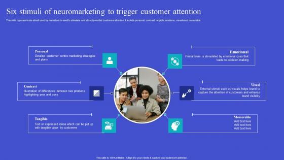 This slide represents six stimuli used by marketers to used to stimulate and attract potential customers attention. It include personal, contrast, tangible, emotions, visuals and memorable. Are you searching for a Exploring Neuromarketing Strategies Six Stimuli Of Neuromarketing Pictures Pdf that is uncluttered, straightforward, and original It is easy to edit, and you can change the colors to suit your personal or business branding. For a presentation that expresses how much effort you have put in, this template is ideal With all of its features, including tables, diagrams, statistics, and lists, it is perfect for a business plan presentation. Make your ideas more appealing with these professional slides. Download Exploring Neuromarketing Strategies Six Stimuli Of Neuromarketing Pictures Pdf from Slidegeeks today. This slide represents six stimuli used by marketers to used to stimulate and attract potential customers attention. It include personal, contrast, tangible, emotions, visuals and memorable.