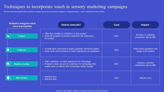 This slide represents methods used by marketers to integrate touch sense in promotional campaigns. It includes techniques comfort, collateral and hands on testing. Retrieve professionally designed Exploring Neuromarketing Strategies Techniques To Incorporate Touch Background Pdf to effectively convey your message and captivate your listeners. Save time by selecting pre made slideshows that are appropriate for various topics, from business to educational purposes. These themes come in many different styles, from creative to corporate, and all of them are easily adjustable and can be edited quickly. Access them as PowerPoint templates or as Google Slides themes. You do not have to go on a hunt for the perfect presentation because Slidegeeks got you covered from everywhere. This slide represents methods used by marketers to integrate touch sense in promotional campaigns. It includes techniques comfort, collateral and hands on testing.