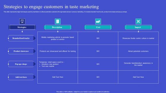 This slide represents major techniques used by marketers to attract potential customers through taste sense in sensory marketing. It includes branded food trucks, product showcase and pop up shops. Present like a pro with Utilizing Neuromarketing Techniques Strategies To Engage Customers Ppt Summary Deck PDF Create beautiful presentations together with your team, using our easy-to-use presentation slides. Share your ideas in real-time and make changes on the fly by downloading our templates. So whether youre in the office, on the go, or in a remote location, you can stay in sync with your team and present your ideas with confidence. With Slidegeeks presentation got a whole lot easier. Grab these presentations today.