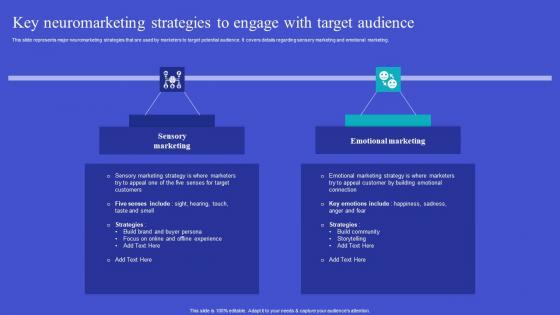 This slide represents major neuromarketing strategies that are used by marketers to target potential audience. It covers details regarding sensory marketing and emotional marketing. The best PPT templates are a great way to save time, energy, and resources. Slidegeeks have 100 percent editable powerpoint slides making them incredibly versatile. With these quality presentation templates, you can create a captivating and memorable presentation by combining visually appealing slides and effectively communicating your message. Download Utilizing Neuromarketing Techniques Key Neuromarketing Strategies To Engage With Target Background PDF from Slidegeeks and deliver a wonderful presentation.