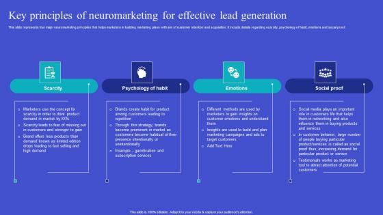 This slide represents four major neuromarketing principles that helps marketers in building marketing plans with aim of customer retention and acquisition. It include details regarding scarcity, psychology of habit, emotions and social proof. Slidegeeks is one of the best resources for PowerPoint templates. You can download easily and regulate Key Principles Of Neuromarketing Exploring Neuromarketing Strategies Guidelines Pdf for your personal presentations from our wonderful collection. A few clicks is all it takes to discover and get the most relevant and appropriate templates. Use our Templates to add a unique zing and appeal to your presentation and meetings. All the slides are easy to edit and you can use them even for advertisement purposes. This slide represents four major neuromarketing principles that helps marketers in building marketing plans with aim of customer retention and acquisition. It include details regarding scarcity, psychology of habit, emotions and social proof.