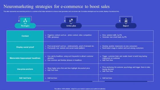 This slide represents neuromarketing tactics in e-commerce that helps marketers to enhance lead generation and conversion rate. It includes strategies such as contest, display of social proof etc. Boost your pitch with our creative Utilizing Neuromarketing Techniques Neuromarketing Strategies Ppt Slides Deck PDF. Deliver an awe-inspiring pitch that will mesmerize everyone. Using these presentation templates you will surely catch everyones attention. You can browse the ppts collection on our website. We have researchers who are experts at creating the right content for the templates. So you dont have to invest time in any additional work. Just grab the template now and use them.