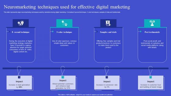 This slide represents major neuromarketing techniques used by marketers during digital marketing. It includes 8 second technique, 3 color techniques, samples and trials and testimonials. Get a simple yet stunning designed Neuromarketing Techniques Used For Exploring Neuromarketing Strategies Guidelines Pdf. It is the best one to establish the tone in your meetings. It is an excellent way to make your presentations highly effective. So, download this PPT today from Slidegeeks and see the positive impacts. Our easy to edit Neuromarketing Techniques Used For Exploring Neuromarketing Strategies Guidelines Pdf can be your go to option for all upcoming conferences and meetings. So, what are you waiting for Grab this template today. This slide represents major neuromarketing techniques used by marketers during digital marketing. It includes 8 second technique, 3 color techniques, samples and trials and testimonials.