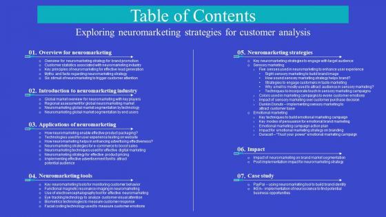 Present like a pro with Table Of Contents Exploring Neuromarketing Strategies For Customer Demonstration Pdf Create beautiful presentations together with your team, using our easy to use presentation slides. Share your ideas in real time and make changes on the fly by downloading our templates. So whether you are in the office, on the go, or in a remote location, you can stay in sync with your team and present your ideas with confidence. With Slidegeeks presentation got a whole lot easier. Grab these presentations today. Our Table Of Contents Exploring Neuromarketing Strategies For Customer Demonstration Pdf are topically designed to provide an attractive backdrop to any subject. Use them to look like a presentation pro.
