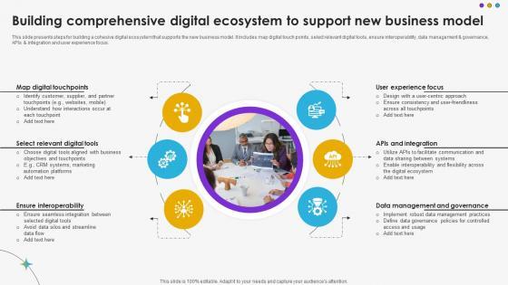 This slide presents steps for building a cohesive digital ecosystem that supports the new business model. It includes map digital touch points, select relevant digital tools, ensure interoperability, data management and governance, APIs and integration and user experience focus.Slidegeeks is here to make your presentations a breeze with Building Comprehensive Digital Ecosystem To Support New Business Model DT SS V With our easy-to-use and customizable templates, you can focus on delivering your ideas rather than worrying about formatting. With a variety of designs to choose from, you are sure to find one that suits your needs. And with animations and unique photos, illustrations, and fonts, you can make your presentation pop. So whether you are giving a sales pitch or presenting to the board, make sure to check out Slidegeeks first This slide presents steps for building a cohesive digital ecosystem that supports the new business model. It includes map digital touch points, select relevant digital tools, ensure interoperability, data management and governance, APIs and integration and user experience focus.