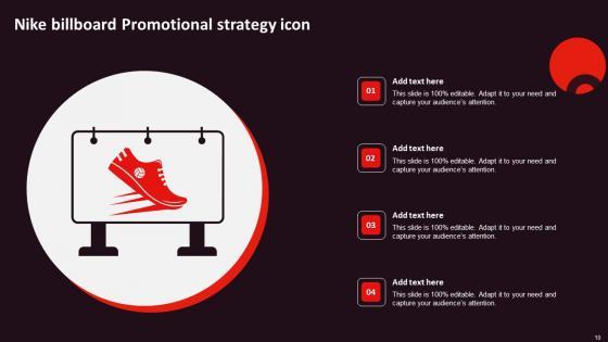 Pitch your topic with ease and precision using this Nike Billboard Promotional Strategy Icon Infographics Pdf This layout presents information on Nike Billboard, Promotional Strategy Icon It is also available for immediate download and adjustment. So, changes can be made in the color, design, graphics or any other component to create a unique layout. Our Nike Billboard Promotional Strategy Icon Infographics Pdf are topically designed to provide an attractive backdrop to any subject. Use them to look like a presentation pro.