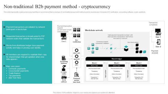 This slide represents cryptocurrency payment flow in ecommerce that is one type of non traditional payment method used by businesses. It includes KYC verification, accounting software, crypto wallet etc. Welcome to our selection of the Non Traditional B2B Payment Method Cryptocurrency B2B Digital Commerce Formats Pdf These are designed to help you showcase your creativity and bring your sphere to life. Planning and Innovation are essential for any business that is just starting out. This collection contains the designs that you need for your everyday presentations. All of our PowerPoints are 100 percent editable, so you can customize them to suit your needs. This multi-purpose template can be used in various situations. Grab these presentation templates today. This slide represents cryptocurrency payment flow in ecommerce that is one type of non traditional payment method used by businesses. It includes KYC verification, accounting software, crypto wallet etc.
