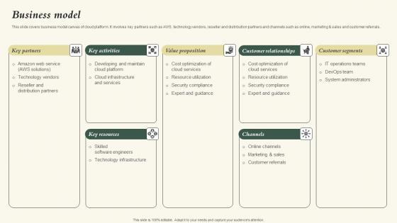 This slide covers business model canvas of cloud platform. It involves key partners such as AWS, technology vendors, reseller and distribution partners and channels such as online, marketing and sales and customer referrals. Boost your pitch with our creative Business Model Nubity Capital Funding Pitch Deck Summary Pdf. Deliver an awe-inspiring pitch that will mesmerize everyone. Using these presentation templates you will surely catch everyones attention. You can browse the ppts collection on our website. We have researchers who are experts at creating the right content for the templates. So you do not have to invest time in any additional work. Just grab the template now and use them. This slide covers business model canvas of cloud platform. It involves key partners such as AWS, technology vendors, reseller and distribution partners and channels such as online, marketing and sales and customer referrals.