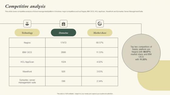 This slide covers competitive analysis of cloud management platform. It involves major competitors such as Nagios, IBM CICS, HCL AppScan, Wavefront and Symantec Server Management Suite. Want to ace your presentation in front of a live audience Our Competitive Analysis Nubity Capital Funding Pitch Deck Formats Pdf can help you do that by engaging all the users towards you. Slidegeeks experts have put their efforts and expertise into creating these impeccable powerpoint presentations so that you can communicate your ideas clearly. Moreover, all the templates are customizable, and easy-to-edit and downloadable. Use these for both personal and commercial use. This slide covers competitive analysis of cloud management platform. It involves major competitors such as Nagios, IBM CICS, HCL AppScan, Wavefront and Symantec Server Management Suite.