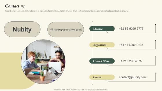 This slide covers basic contact information of cloud management and monitoring platform. It involves details such as phone number, contact email and headquarter details of company. There are so many reasons you need a Contact Us Nubity Capital Funding Pitch Deck Infographics Pdf. The first reason is you can not spend time making everything from scratch, Thus, Slidegeeks has made presentation templates for you too. You can easily download these templates from our website easily. This slide covers basic contact information of cloud management and monitoring platform. It involves details such as phone number, contact email and headquarter details of company.