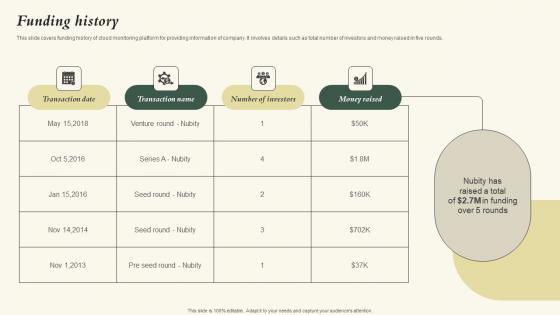 This slide covers funding history of cloud monitoring platform for providing information of company. It involves details such as total number of investors and money raised in five rounds. Do you have an important presentation coming up Are you looking for something that will make your presentation stand out from the rest Look no further than Funding History Nubity Capital Funding Pitch Deck Rules Pdf. With our professional designs, you can trust that your presentation will pop and make delivering it a smooth process. And with Slidegeeks, you can trust that your presentation will be unique and memorable. So why wait Grab Funding History Nubity Capital Funding Pitch Deck Rules Pdf today and make your presentation stand out from the rest. This slide covers funding history of cloud monitoring platform for providing information of company. It involves details such as total number of investors and money raised in five rounds.