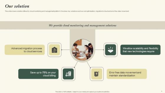 This slide covers solution offered by cloud monitoring and management platform. It involves key solutions such as cost optimization, migration to cloud and error free data movement. Make sure to capture your audiences attention in your business displays with our gratis customizable Our Solution Nubity Capital Funding Pitch Deck Mockup Pdf. These are great for business strategies, office conferences, capital raising or task suggestions. If you desire to acquire more customers for your tech business and ensure they stay satisfied, create your own sales presentation with these plain slides. This slide covers solution offered by cloud monitoring and management platform. It involves key solutions such as cost optimization, migration to cloud and error free data movement.