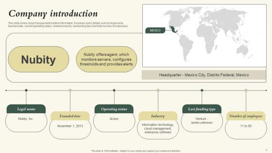 This slide covers cloud management solution information. It involves basic details such as legal name, founded date, current operating status, oriented industry, last funding type and total number of employees. Slidegeeks is one of the best resources for PowerPoint templates. You can download easily and regulate Company Introduction Nubity Capital Funding Pitch Deck Demonstration Pdf for your personal presentations from our wonderful collection. A few clicks is all it takes to discover and get the most relevant and appropriate templates. Use our Templates to add a unique zing and appeal to your presentation and meetings. All the slides are easy to edit and you can use them even for advertisement purposes. This slide covers cloud management solution information. It involves basic details such as legal name, founded date, current operating status, oriented industry, last funding type and total number of employees.