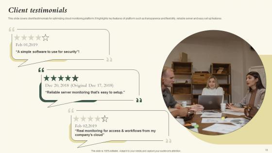 This slide covers client testimonials for optimizing cloud monitoring platform. It highlights key features of platform such as transparence and flexibility, reliable server and easy set up features. Create an editable Client Testimonials Nubity Capital Funding Pitch Deck Background Pdf that communicates your idea and engages your audience. Whether you are presenting a business or an educational presentation, pre-designed presentation templates help save time. Client Testimonials Nubity Capital Funding Pitch Deck Background Pdf is highly customizable and very easy to edit, covering many different styles from creative to business presentations. Slidegeeks has creative team members who have crafted amazing templates. So, go and get them without any delay. This slide covers client testimonials for optimizing cloud monitoring platform. It highlights key features of platform such as transparence and flexibility, reliable server and easy set up features.