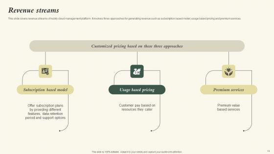 This slide covers revenue streams of nubity cloud management platform. It involves three approaches for generating revenue such as subscription based model, usage based pricing and premium services. This modern and well-arranged Revenue Streams Nubity Capital Funding Pitch Deck Graphics Pdf provides lots of creative possibilities. It is very simple to customize and edit with the Powerpoint Software. Just drag and drop your pictures into the shapes. All facets of this template can be edited with Powerpoint no extra software is necessary. Add your own material, put your images in the places assigned for them, adjust the colors, and then you can show your slides to the world, with an animated slide included. This slide covers revenue streams of nubity cloud management platform. It involves three approaches for generating revenue such as subscription based model, usage based pricing and premium services.