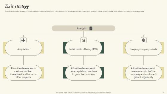This slide covers exit strategy of cloud monitoring platform. It highlights major three kind of strategies can be adopted by company such as acquisition, initial public offering and keeping company private. From laying roadmaps to briefing everything in detail, our templates are perfect for you. You can set the stage with your presentation slides. All you have to do is download these easy-to-edit and customizable templates. Exit Strategy Nubity Capital Funding Pitch Deck Guidelines Pdf will help you deliver an outstanding performance that everyone would remember and praise you for. Do download this presentation today. This slide covers exit strategy of cloud monitoring platform. It highlights major three kind of strategies can be adopted by company such as acquisition, initial public offering and keeping company private.