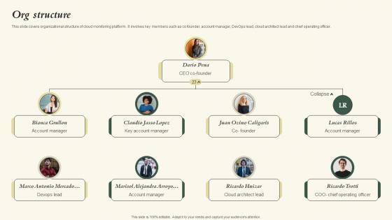 This slide covers organizational structure of cloud monitoring platform. It involves key members such as co founder, account manager, DevOps lead, cloud architect lead and chief operating officer. Crafting an eye-catching presentation has never been more straightforward. Let your presentation shine with this tasteful yet straightforward Org Structure Nubity Capital Funding Pitch Deck Slides Pdf template. It offers a minimalistic and classy look that is great for making a statement. The colors have been employed intelligently to add a bit of playfulness while still remaining professional. Construct the ideal Org Structure Nubity Capital Funding Pitch Deck Slides Pdf that effortlessly grabs the attention of your audience. Begin now and be certain to wow your customers. This slide covers organizational structure of cloud monitoring platform. It involves key members such as co founder, account manager, DevOps lead, cloud architect lead and chief operating officer.