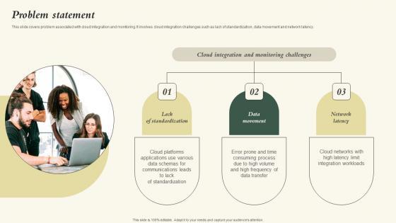 This slide covers problem associated with cloud integration and monitoring. It involves cloud integration challenges such as lack of standardization, data movement and network latency. Formulating a presentation can take up a lot of effort and time, so the content and message should always be the primary focus. The visuals of the PowerPoint can enhance the presenters message, so our Problem Statement Nubity Capital Funding Pitch Deck Demonstration Pdf was created to help save time. Instead of worrying about the design, the presenter can concentrate on the message while our designers work on creating the ideal templates for whatever situation is needed. Slidegeeks has experts for everything from amazing designs to valuable content, we have put everything into Problem Statement Nubity Capital Funding Pitch Deck Demonstration Pdf. This slide covers problem associated with cloud integration and monitoring. It involves cloud integration challenges such as lack of standardization, data movement and network latency.