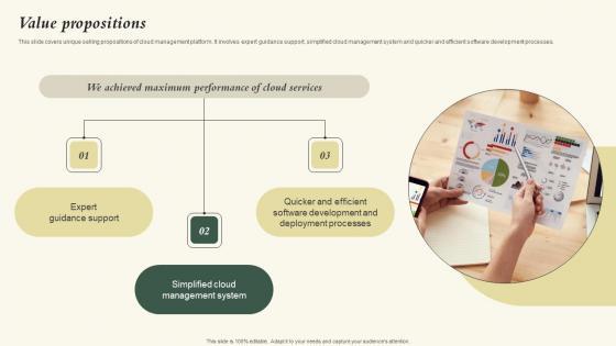 This slide covers unique selling propositions of cloud management platform. It involves expert guidance support, simplified cloud management system and quicker and efficient software development processes. Explore a selection of the finest Value Propositions Nubity Capital Funding Pitch Deck Microsoft Pdf here. With a plethora of professionally designed and pre-made slide templates, you can quickly and easily find the right one for your upcoming presentation. You can use our Value Propositions Nubity Capital Funding Pitch Deck Microsoft Pdf to effectively convey your message to a wider audience. Slidegeeks has done a lot of research before preparing these presentation templates. The content can be personalized and the slides are highly editable. Grab templates today from Slidegeeks. This slide covers unique selling propositions of cloud management platform. It involves expert guidance support, simplified cloud management system and quicker and efficient software development processes.