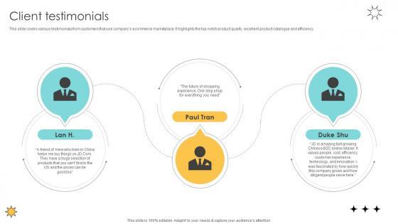 This slide covers various testimonials from customers that use companys ecommerce marketplace. It highlights the top-notch product quality, excellent product catalogue and efficiency. Create an editable Client Testimonials Online Marketplace Pitch Deck that communicates your idea and engages your audience. Whether you are presenting a business or an educational presentation, pre-designed presentation templates help save time. Client Testimonials Online Marketplace Pitch Deck is highly customizable and very easy to edit, covering many different styles from creative to business presentations. Slidegeeks has creative team members who have crafted amazing templates. So, go and get them without any delay. This slide covers various testimonials from customers that use companys ecommerce marketplace. It highlights the top-notch product quality, excellent product catalogue and efficiency.