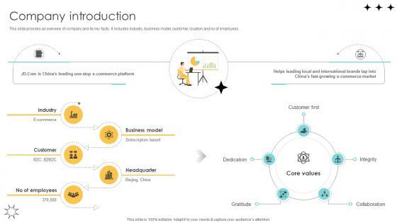 This slide provides an overview of company and its key facts. It includes industry, business model, customer, location and no of employees. Slidegeeks is one of the best resources for PowerPoint templates. You can download easily and regulate Company Introduction Online Marketplace Pitch Deck for your personal presentations from our wonderful collection. A few clicks is all it takes to discover and get the most relevant and appropriate templates. Use our Templates to add a unique zing and appeal to your presentation and meetings. All the slides are easy to edit and you can use them even for advertisement purposes. This slide provides an overview of company and its key facts. It includes industry, business model, customer, location and no of employees.