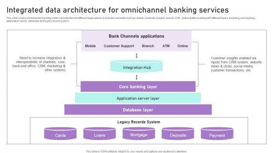 This slide covers omnichannel banking system architecture for different applications. It includes elements such as mobile, customer support, branch, ATM, online platform along with different layers including core banking, application server, database and legacy record system. Are you in need of a template that can accommodate all of your creative concepts This one is crafted professionally and can be altered to fit any style. Use it with Google Slides or PowerPoint. Include striking photographs, symbols, depictions, and other visuals. Fill, move around, or remove text boxes as desired. Test out color palettes and font mixtures. Edit and save your work, or work with colleagues. Download Integrated Data Architecture For Omnichannel Banking Services Information PDF and observe how to make your presentation outstanding. Give an impeccable presentation to your group and make your presentation unforgettable.
