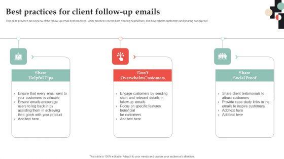 This slide provides an overview of the follow-up email best practices. Major practices covered are sharing helpful tops, dont overwhelm customers and sharing social proof. Crafting an eye catching presentation has never been more straightforward. Let your presentation shine with this tasteful yet straightforward Customer Onboarding Journey Optimization Plan Best Practices For Client Follow Up Emails Information PDF template. It offers a minimalistic and classy look that is great for making a statement. The colors have been employed intelligently to add a bit of playfulness while still remaining professional. Construct the ideal Customer Onboarding Journey Optimization Plan Best Practices For Client Follow Up Emails Information PDF that effortlessly grabs the attention of your audience Begin now and be certain to wow your customers.