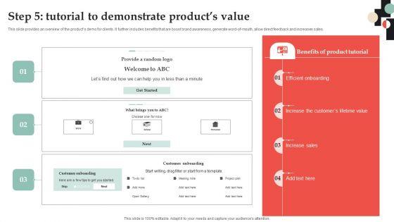 This slide provides an overview of the products demo for clients. It further includes benefits that are boost brand awareness, generate word-of-mouth, allow direct feedback and increases sales. Explore a selection of the finest Customer Onboarding Journey Optimization Plan Step 5 Tutorial To Demonstrate Summary PDF here. With a plethora of professionally designed and pre made slide templates, you can quickly and easily find the right one for your upcoming presentation. You can use our Customer Onboarding Journey Optimization Plan Step 5 Tutorial To Demonstrate Summary PDF to effectively convey your message to a wider audience. Slidegeeks has done a lot of research before preparing these presentation templates. The content can be personalized and the slides are highly editable. Grab templates today from Slidegeeks.