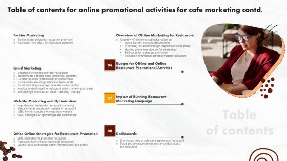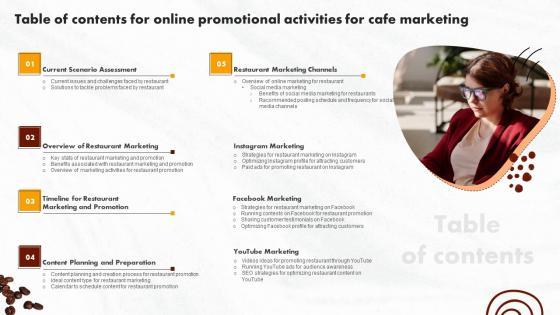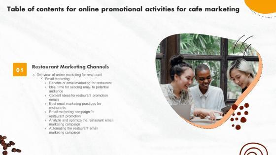 Are you in need of a template that can accommodate all of your creative concepts This one is crafted professionally and can be altered to fit any style. Use it with Google Slides or PowerPoint. Include striking photographs, symbols, depictions, and other visuals. Fill, move around, or remove text boxes as desired. Test out color palettes and font mixtures. Edit and save your work, or work with colleagues. Download Table Of Contents Online Promotional Activities For Cafe Marketing Template Pdf and observe how to make your presentation outstanding. Give an impeccable presentation to your group and make your presentation unforgettable. Our Table Of Contents Online Promotional Activities For Cafe Marketing Template Pdf are topically designed to provide an attractive backdrop to any subject. Use them to look like a presentation pro.