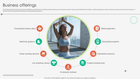 This slide presents products and services offered by online fitness coaching business start-up. It showcases services such as personalized workout plans, nutritional guidance, virtual coaching sessions, live streaming classes, on-demand workout, progress tracking tools and specialized programs.Do you have an important presentation coming up Are you looking for something that will make your presentation stand out from the rest Look no further than Business Offerings Online Fitness Tutoring Business Market Entry Plan GTM SS V. With our professional designs, you can trust that your presentation will pop and make delivering it a smooth process. And with Slidegeeks, you can trust that your presentation will be unique and memorable. So why wait Grab Business Offerings Online Fitness Tutoring Business Market Entry Plan GTM SS V today and make your presentation stand out from the rest This slide presents products and services offered by online fitness coaching business start-up. It showcases services such as personalized workout plans, nutritional guidance, virtual coaching sessions, live streaming classes, on-demand workout, progress tracking tools and specialized programs.