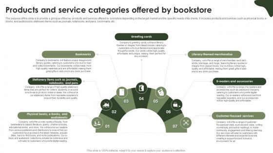 The purpose of this slide is to provide a glimpse of the key products and services offered by bookstore depending on the target market and the specific needs of its clients. It includes products and services such as physical books, e-books, and audiobooks, stationery items such as journals, notebooks, and pens, bookmarks, etc. Are you searching for a Online Bookstore Business Plan Products And Service Categories Offered By Bookstore BP SS V that is uncluttered, straightforward, and original Its easy to edit, and you can change the colors to suit your personal or business branding. For a presentation that expresses how much effort you have put in, this template is ideal With all of its features, including tables, diagrams, statistics, and lists, its perfect for a business plan presentation. Make your ideas more appealing with these professional slides. Download Online Bookstore Business Plan Products And Service Categories Offered By Bookstore BP SS V from Slidegeeks today. The purpose of this slide is to provide a glimpse of the key products and services offered by bookstore depending on the target market and the specific needs of its clients. It includes products and services such as physical books, e-books, and audiobooks, stationery items such as journals, notebooks, and pens, bookmarks, etc.