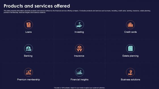 This slide presents information about the products and services offered by the financial services offering company. It includes products and services such as loans, investing, credit cards, banking, insurance, estate planning, premium membership, financial insights and business solutions. Coming up with a presentation necessitates that the majority of the effort goes into the content and the message you intend to convey. The visuals of a PowerPoint presentation can only be effective if it supplements and supports the story that is being told. Keeping this in mind our experts created Products And Services Offered Online Financial Services Platform Ppt Slides to reduce the time that goes into designing the presentation. This way, you can concentrate on the message while our designers take care of providing you with the right template for the situation. This slide presents information about the products and services offered by the financial services offering company. It includes products and services such as loans, investing, credit cards, banking, insurance, estate planning, premium membership, financial insights and business solutions.