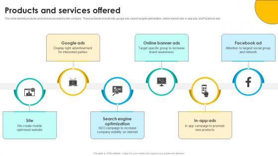 This slide exhibits products and services provided by the company. These products include site, google ads, search engine optimization, online banner ads, in-app ads, and Facebook ads. Coming up with a presentation necessitates that the majority of the effort goes into the content and the message you intend to convey. The visuals of a PowerPoint presentation can only be effective if it supplements and supports the story that is being told. Keeping this in mind our experts created Products And Services Offered Online Marketing Solutions Pitch Deck to reduce the time that goes into designing the presentation. This way, you can concentrate on the message while our designers take care of providing you with the right template for the situation. This slide exhibits products and services provided by the company. These products include site, google ads, search engine optimization, online banner ads, in-app ads, and Facebook ads.