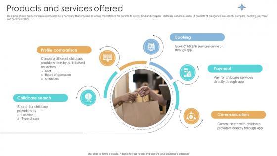 This slide shows products services provided by a company that provides an online marketplace for parents to quickly find and compare childcare services nearby. It consists of categories like search, compare, booking, payment and communication. Find highly impressive Products And Services Offered Online Marketplace Investor Funding Elevator Pitch Deck Ppt Slide on Slidegeeks to deliver a meaningful presentation. You can save an ample amount of time using these presentation templates. No need to worry to prepare everything from scratch because Slidegeeks experts have already done a huge research and work for you. You need to download Products And Services Offered Online Marketplace Investor Funding Elevator Pitch Deck Ppt Slide for your upcoming presentation. All the presentation templates are 100 percent editable and you can change the color and personalize the content accordingly. Download now This slide shows products services provided by a company that provides an online marketplace for parents to quickly find and compare childcare services nearby. It consists of categories like search, compare, booking, payment and communication.