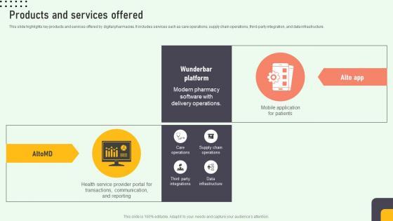 This slide highlights key products and services offered by digital pharmacies. It includes services such as care operations, supply chain operations, third-party integration, and data infrastructure. Are you searching for a Products And Services Offered Online Medication Management Platform Pitch Deck that is uncluttered, straightforward, and original Its easy to edit, and you can change the colors to suit your personal or business branding. For a presentation that expresses how much effort you have put in, this template is ideal With all of its features, including tables, diagrams, statistics, and lists, its perfect for a business plan presentation. Make your ideas more appealing with these professional slides. Download Products And Services Offered Online Medication Management Platform Pitch Deck from Slidegeeks today. This slide highlights key products and services offered by digital pharmacies. It includes services such as care operations, supply chain operations, third-party integration, and data infrastructure.